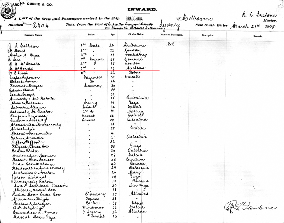 Passenger list Gracchus 21/03/1908 port of Sydney