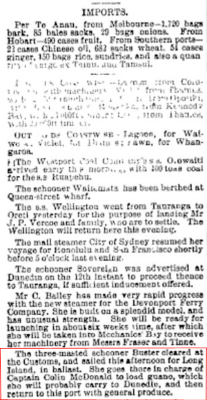 IMPORTS The three-masted schooner Buster cleared at the Customs, and sailed this afternoon for Long Island, in ballast. She goes there in charge of Captain Colin McDonald to load guano, which she will probably carry to Dunedin and then return to this port with general produce.