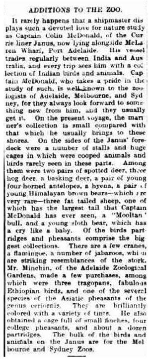 It rarely happens that a shipmaster displays such a devoted love for nature study as Captain Colin McDonald, of the Currie liner Janus, now lying alongside McLaren Wharf, Port Adelaide. His vessel trades regularly between India and Australia, and every trip sees him with a collection of Indian birds and animals. Captain McDonald, who takes a pride in the study of such, is well known to the zoologists of Adelaide, Melbourne, and Sydney, for they always look forward to something new from him, and they usually get it. On the present voyage, the mariner's collection is small compared with that which he usually brings to these shores. On the sides of the Janus' fore deck were a number of stalls and huge cages in which were cooped animals and birds rarely seen in these parts. Among them were two pairs of spotted deer, three hog deer, a basking deer, a pair of young four-horned antelopes, a hyena, a pair of young Himalayan brown bears—which are very rare—three fat tailed sheep, one of which has the largest tail that Captain McDonald has ever seen, a "Mooltan' bull, and a young sloth bear, which has a cry like a baby. Of the birds partridges and pheasants comprise the biggest collections. There are a few cranes, a flamingoe, a number of jabaroos, which are striking resemblances of the stork. Mr. Minchin, of the Adelaide Zoological Gardens, made a few purchases, among which were three tragopans, fabulous Ethiopian birds, and one of the several species of the Asiatic pheasants of the genus ceriornis. They are brilliantly colored with a variety of tints. He also obtained a cage full of small finches, four college pheasants, and about a dozen partridges. The bulk of the birds and animals on the Janus are for the Melbourne and Sydney Zoos. |