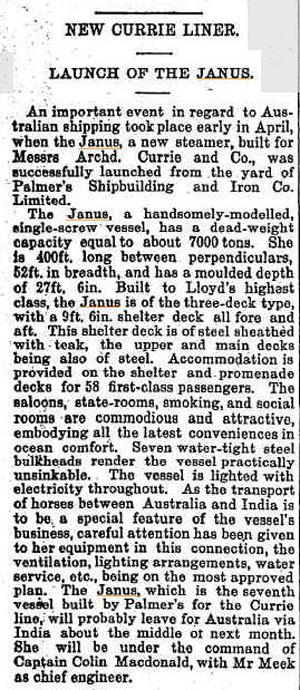 NEW CURRIE LINER. LAUNCH OF THE JANUS. An important event in regard to Australian shipping took place early in April, when the Janus, a new steamer, built for Messrs Archd. Currie and Co., was successfully launched from the yard of Palmer's Shipbuilding and Iron Co.Limited. The Janus, a handsomely-modelled, single-screw vessel, has a dead-weight capacity equal to about 7000 tons. She ia 400ft. long between perpendiculars, 52ft. in breadth, and has a moulded depth of 27ft, 6in. Built to Lloyd's highest class, the Janus is of the three-deck type, with a 9ft. 6in. shelter deck all fore and aft. This shelter deck is of steel sheathed with teak, the upper and main decks being also of steel. Accommodation is provided on the shelter and. promenade decks for 58 first-class passengers. The saloons, state-rooms, smoking, and social rooms are commodious and attractive, embodying all the latest conveniences in ocean comfort. Seven water-tight steel bulkheads render the vessel practically unsinkable. The vessel is lighted with electricity throughout. As the transport of horses between Australia and India is to be a special feature of the vessel's business, careful attention has been given to her equipment in this connection, the ventilation, lighting arrangements, water service, etc., being on the most approved plan. The Janus, which is the seventh vessel built by Palmer's for the Currie line, will probably leave for Australia via India about the middle ot next month. She will be under the command of Captain Colin Macdonald, with Mr Meek as chief engineer. |