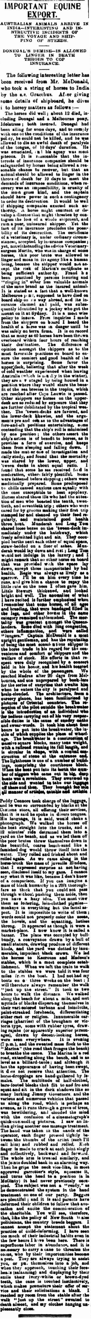 The following interesting letter has been received from Mr. McDonald, who took a string of horses to India by the s.s. Gracchus. After giving some details of shipboard, he dives in to horsey matters as follows : — The horses did well ; about 12 died, in including Donegal and a Melbourne pony, Idolatress ; both insured. Donegal had been ailing for some days, and to comply with one of the conditions of the insurance policy, he could not be killed, and he was allowed to die an awful death of paralysis of the tongue, of 10 days' duration. He was emaciated, and his agony was most piteous. It is reasonable that the interests of insurance companies should be safeguarded by horses being allowed a reasonable chance to recover, but that an animal should be allowed to linger in the throes of death for 10 days to meet the demands of insurance conditions, when recovery was an impossibility, is cruelty of the most gross kind, and the captain should have power in such a contingency to order its destruction. It would be well if Shipping companies exacted such authority. A horse might contract or develop a disease that might threaten by contagion the loss of a whole shipment, and ruin a poor, uninsured shipper. Yet the fact of its insurance precludes the possibility of its destruction. The certificate of a veterinary is, under ordinary circumstances, accepted, by insurance companies ; yet, notwithstanding the advice Veterinary surgeon Martin, who was in charge of some horses, this poor brute was allowed to linger and moan in its agony like a human being, because the shipper would not accept the risk of Martin's certificate as being sufficient authority. Fraud has been practised by persons insuring and 'ringing in' other less valuable animals of the same brand as the insured animal It is stated as a fact that a well-known Melbourne pony supposed to have died on board ship on its way abroad, and its insurance claimed and paid, was subsequently identified by a jockey who got the mount on it at Sydney. It is a most wise policy to insure. From inquiries I made from the shippers on board I heard the health of a horses was in danger until he was safely on terra firma. It is on record that as many as 40 horses have been thrown overboard within four hours of reaching their destination. The difference of opinion amongst the shippers as to the most favourable positions on board to ensure the comfort and good health of the horses is surprising. Some favor the upper deck, believing that after the week of cold weather experienced when leaving Australia (which is usually in the winter), they are advantaged by being housed in a position where they would share the benefit of the sea breezes in the tropics, which are reached after Cape Leuwin is passed. Other shippers say horses on the upper deck are so reduced by exposure that they are further debilitated by the tropical weather. The 'tween-decks are favored, and the lower-deck likewise, and the arguments pro and con as to the advantages of fore-and-aft positions entertaining, some contending that the ship's roll is minimised by one position ; the others assert the ship's action is of benefit to horses, as it provides a form of exercise, and keeps them from sleeping and falling down. I made the matter one of investigation and daily study, and found that the mortality was shared by the lower, upper, and 'tween decks in about equal ratio. I found that some horses received food in moderation, others fairly plentiful. Some were fattened before shipping ; others were medicinally prepared, some predisposed to chills caused anxious care equally with the ones susceptible to heat apoplexy. Horses shared those ills who had the attention of men who boasted the tenth, twentieth, and seventieth trip ; others who were cared for by grooms making their first trip stamped for and cleaned up their feed regularly, and maintained good health throughout. Munderah and Long Tom shared loose boxes on the 'tween-deck immediately under the hatchway, which freely admitted light and air. They occupied berths next each other of equal space, straw-bedded on a floor of ashes. Munderah would lay down and rest ; Long Tom would not indulge in the luxury ; and I might remark that no other horse on board that was provided with the space lay down, except those incapacitated by bad health, Regio was always as lively as a sparrow. I'll be on him every time he runs, and give him a chance to repay the little rubs on the nose I often gave him. Little Stewart thickened, and looked bright and well. The anomalies of what 1 have recited is further emphasised when I remember that Some horses, of all ages and breading, that were bandaged filled in the legs, and other horses in the same category remained unblemished. The mortality was greatest amongst the Queenslanders. Some died with lung congestion, others inflammation, and were called " lungers." Captain McDonald is a most upright gentleman, find has the reputation of being the most conscientious skipper in the horse trade in his regard for the convenience and comfort of shippers and the welfare of stock. His efforts in that respect were duly recognised by a concert held in his honor, and his health toasted by the whole of the passengers. We reached Madras after 30 days from Melbourne, and one unprepared by book-lore for the series of surprises that awaits him when he enters the city is paralysed and brain-clouded. The architecture, from a cursory glance, has been familiarised by pictures of Oriental countries. The reception of the pilot outside the breakwater is the introduction of an individual who for tedious carrying out of his very responsible duties is the cause of sundry oaths and swear-words. It took him about four hours to put into the breakwater, the inside of which supplies the place of wharfage. The breakwater is a construction of massive square blocks, many tons weight, with a railroad running its full length, and is circular in shape, with a conical 