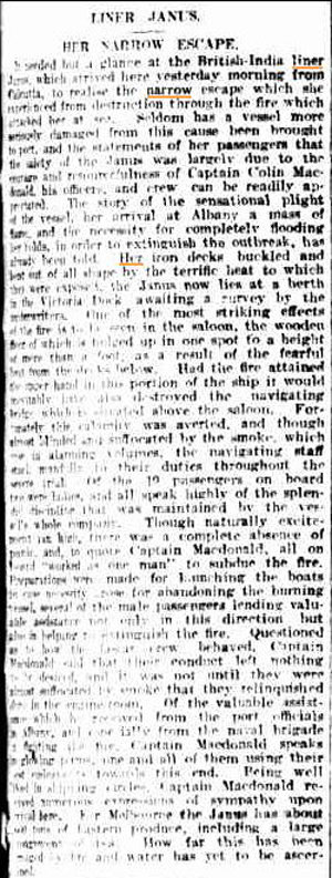 LINER JANUS. HER NARROW ESCAPE. It needed but a glance at the British-India liner Janus, which arrived here yesterday morning from Calcutta to realise the narrow escape which she experienced from destruction through fire which attacked her at sea. Seldom has a vessel more seriously damaged from this cause been brought to port, and the statements of her passengers that the safety of the Janus was largely due to the courage and resourcefulness of Captain Colin Macdonald, his officers, and crew can be readily appreciated. The story of the sensational plight of the vessel, her arrival at Albany a mass of flame, and the necessity for completely flooding her holds, in order to extinguish the outbreak, has already been told. Her iron decks buckled and bent out of all shape by the terrific heat to which they were exposed, the Janus now lies at a berth in the Victoria Dock awaiting a survey by the underwriters. One of the most striking effects of the fire is to be seen in the saloon, the wooden floor of which is bulged up in one spot to a height of more than a foot, as a result of the fearful heat from the decks below. Had the fire attained the upper hand in this portion of the ship it would invariably have also destroyed the navigating bridge which is located above the saloon. Fortunately this calamity was averted, and though almost blinded and suffocated by the smoke, which was in alarming volumes, the navigating staff stuck manfully to their duties throughout the whole trial. Of the 10 passengers on board two were ladies, and all speak highly of the splendid discipline that was maintained by the vessel's whole company. Though naturally excitement ran high. there was a complete absence of panic, and to quote Captain Macdonald, all on board "worked as one man" to subdue the fire. Preparations were made for launching the boats in case necessity rose for abandoning the burning vessel, several of the male passengers lending valuable assistance, not only in this direction but also in helping to extinguish the fire. Questioned as to how the Lascar crew behaved, Captain Macdonald said that their conduct left nothing to be desired and it was not until they were almost suffocated by smoke that they relinquished ?? in the engine room. Of the valuable assistance he received from the port officials at Albany, and especially from the naval brigade in fighting the fire, Captain Macdonald speaks in glowing terms, one and all of them using their (unreadable) towards this end. Being well (unreadable) in shipping (unreadable), Captain Macdonald received several expressions of sympathy upon arrival here. For Melbourne the Janus has about (unreadable) tons of Eastern produce, including a large (unreadable). How far this has been damaged by fire and water has yet to be ascertained. |