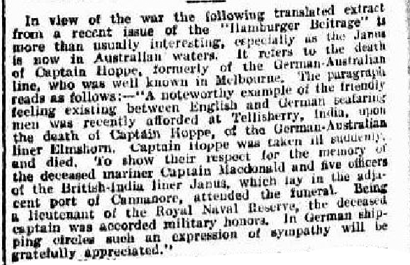 In view of the war the following translated extract from a recent issue of the "Hamburger Beitage" is more than usually interesting, especially as the Janus is now in Australian waters. It refers to the death of Captain Hoppe, formerly of the German-Australian Line, who was well known in Melbourne. The paragraph reads as follows: