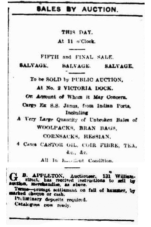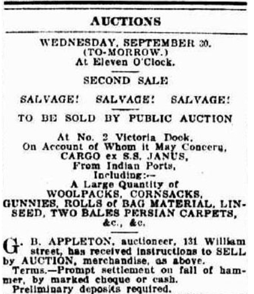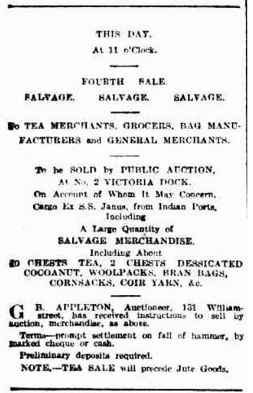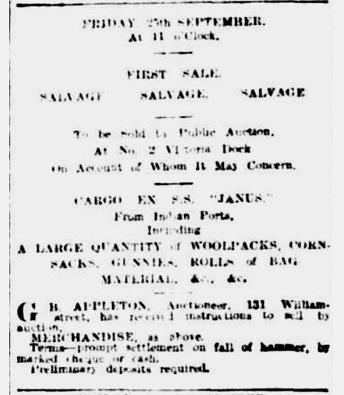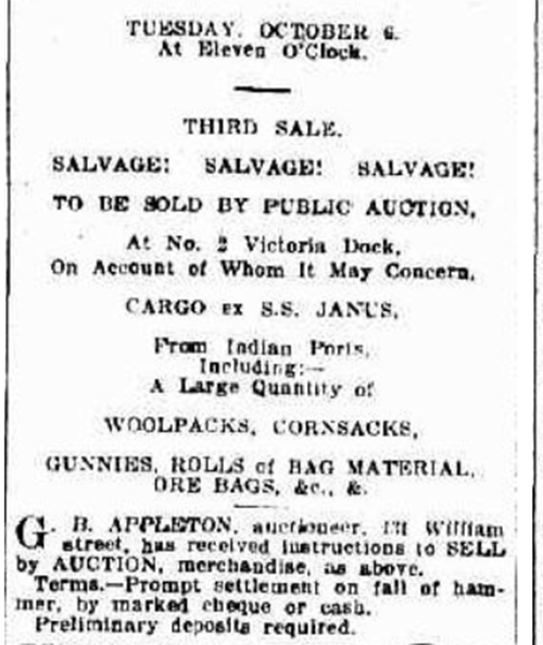 Auction of water damaged goods from the cargo of the s.s Janus 1914 |